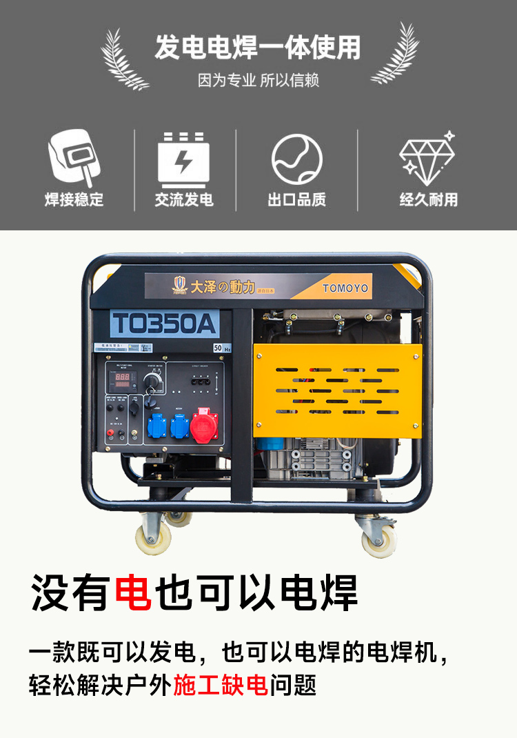 可发电可电焊,我厂的发电电焊机质量有保障,大泽动力发电电焊机功率大,耗油低,节油控油,价格合理,质量过关,拥有各项证书,可检验,中日技术研究。