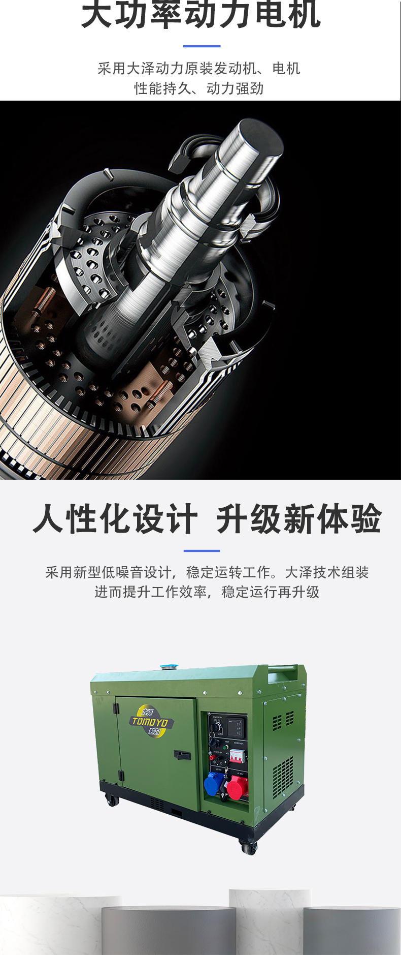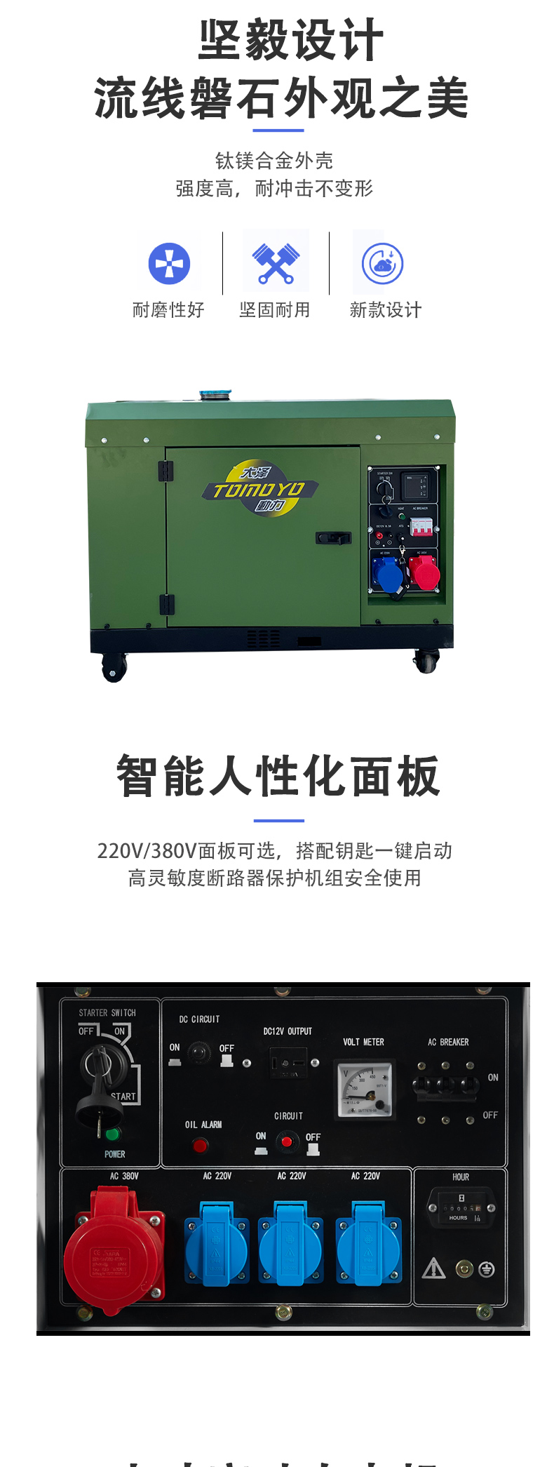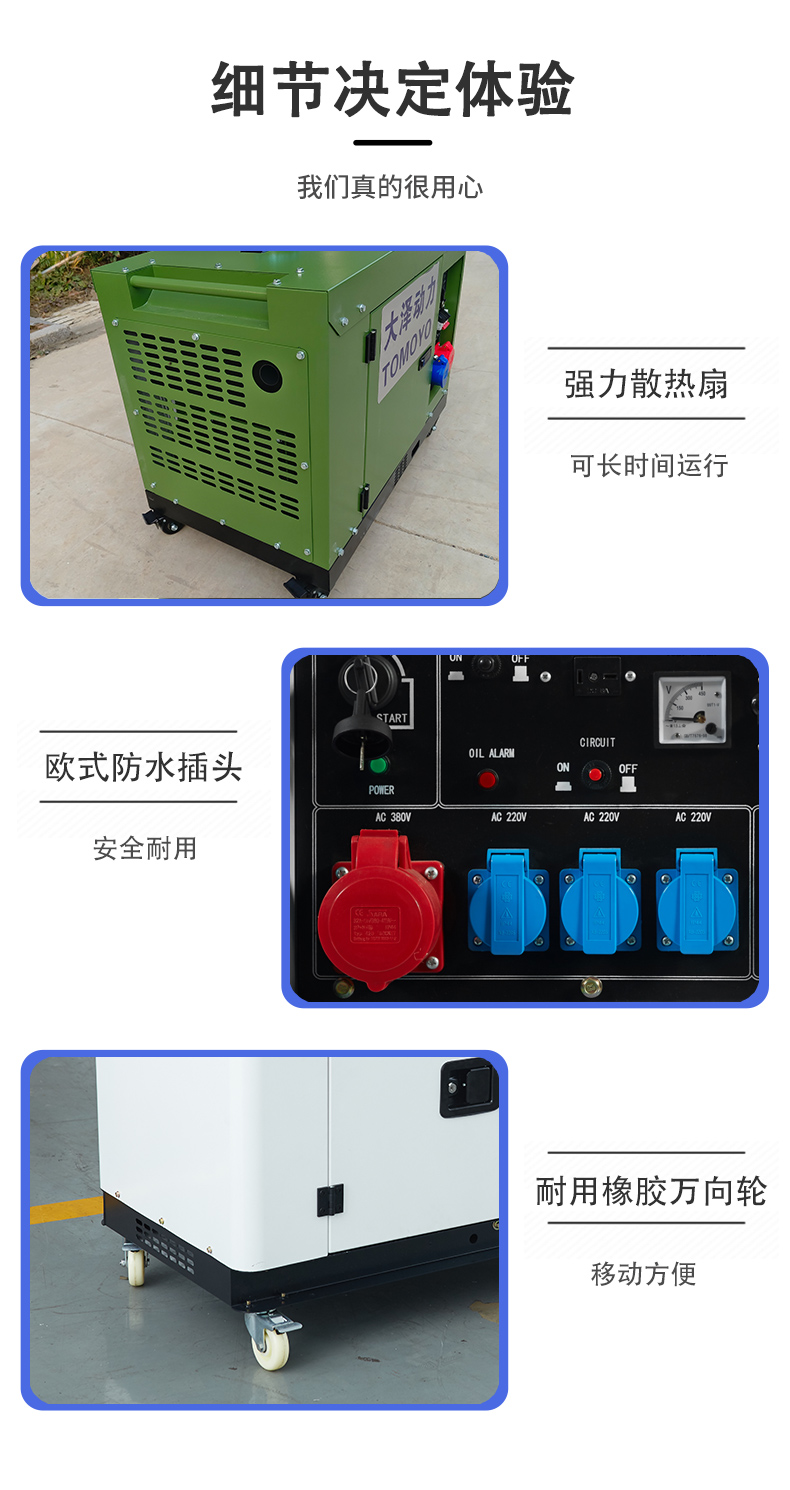高原适应性强 针对高原地区低气压、低氧含量等恶劣环境进行了优化设计,能够在高海拔地区稳定运行,满足如野外勘探、山区施工等特殊场景下的用电需求。 静音效果好 部分型号采用静音式设计,有效降低了运行时的噪音。例如TO7900R-A型号,在7米处实测噪音仅为68-72分贝,适合对噪音要求严格的场所使用,如医院、学校、住宅区附近的临时供电,以及室内活动等。